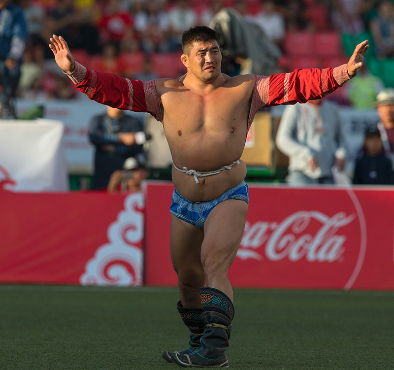 Mongolian wrestling is a full-contact sport played in the outdoor area on the grass during summer, in indoor stadiums during winter. Mongolian wrestling has no classifications based on age or weight, and all wrestlers compete under the same category. The objective of wrestling is to force any part of the opponent’s body except the palm to touch the ground. Mongolian wrestling takes a format of elimination. In Naadam festival, 512 or 1024 wrestlers participate in 9 or 10 rounds of the wrestling competition. Special anniversary years, 1024 wrestlers compete in Naadam. For example, the 800th anniversary of the foundation of the Mongol Empire was 2006.