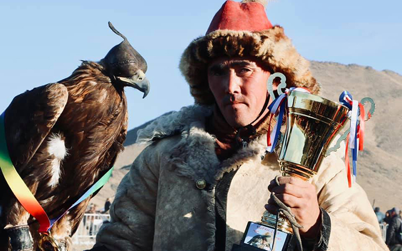 28 years old eagle hunter Nuraisal Manai whose father also won two times glorious title of champion. This year, he has achieved honored 3rd place at the festival by showing his skills on his blood.