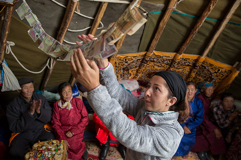 The wedding was continued with the wrestling champion, all guys wrestled, the visitors enjoyed the wrestling and had fun. After this, they are invited to the teepee again and the young couples had changed their clothes which says something deep meaning that they now officially own their new home and it is time to settle down. Now they are at home and the bride became a wife, so she has to offer meals to the guests. Visitors gave wedding gifts to the couples and the strange thing was hanging Mongolian tugriks/ money/ as a gift. It is the indigenous marriage, especially mysterious Tsaatan people’s wedding.