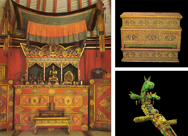 Ancient Mongolians had their own tribal totems, revered and offered prayers to them. They carved out of wood to create different objects of Shamanism cult in the form of beasts, birds, animals, which could very well be regarded authentic works of carving, applique, and ornamentation in special rhythm and composition.
